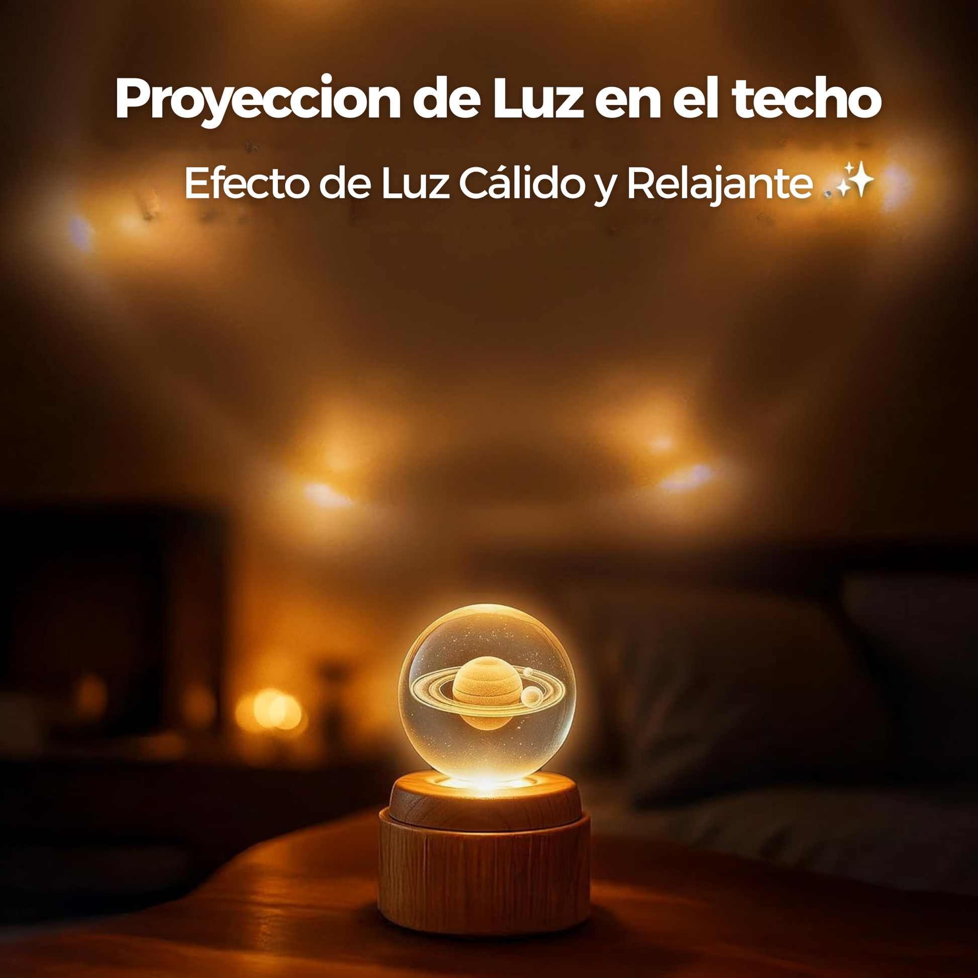 La esfera de cristal comienza a girar lentamente, proyectando un efecto visual relajante que llena la habitación de calma.